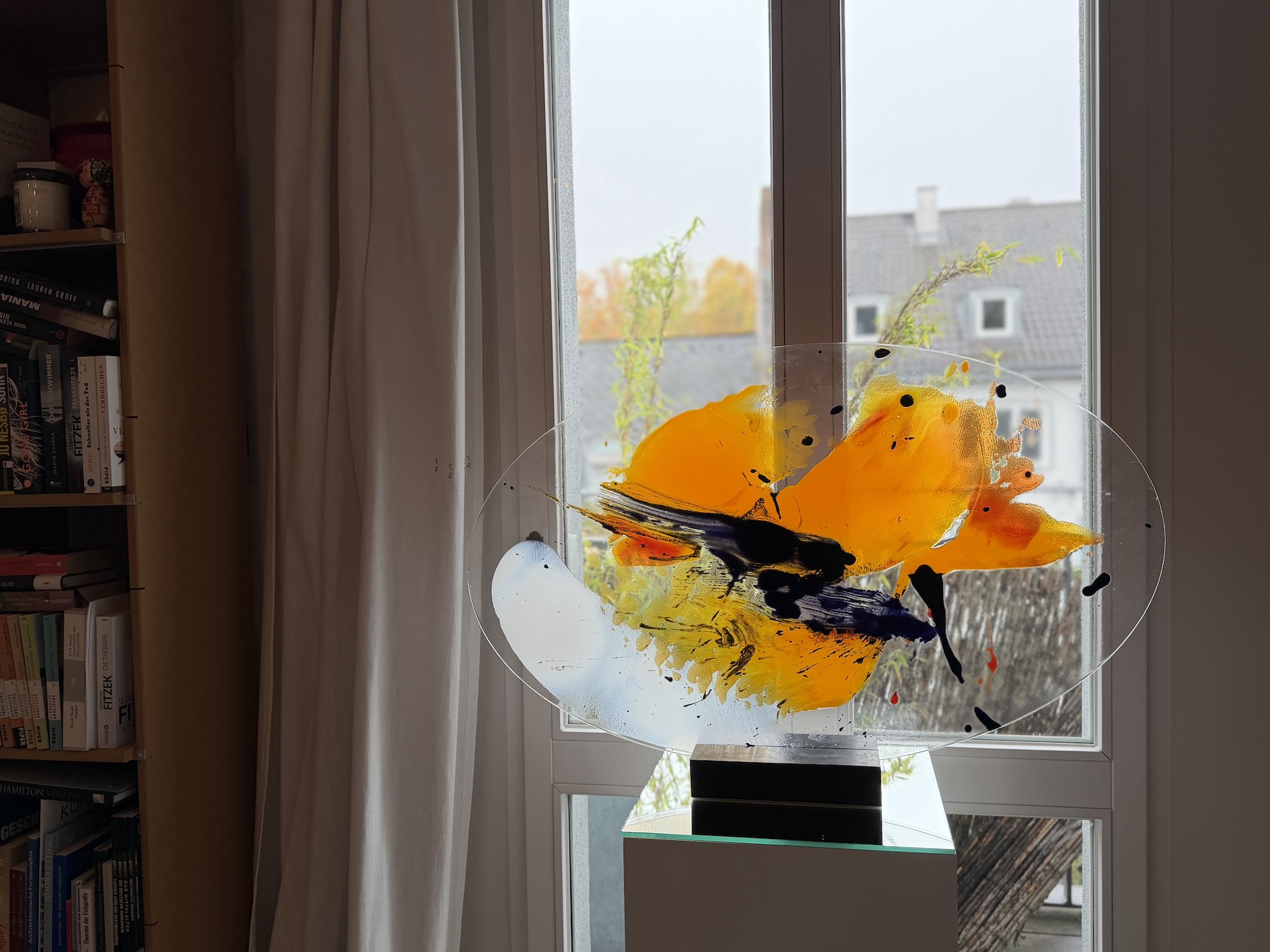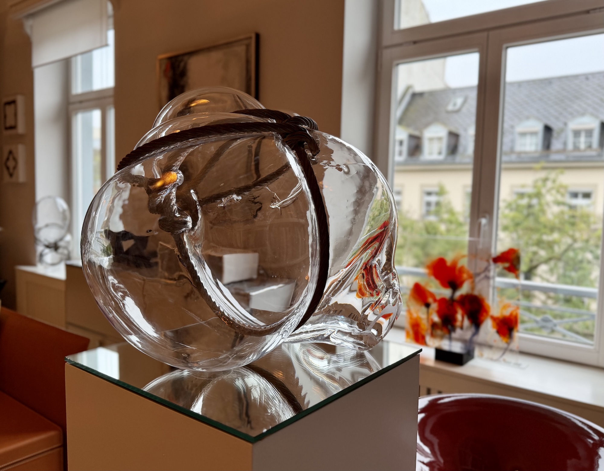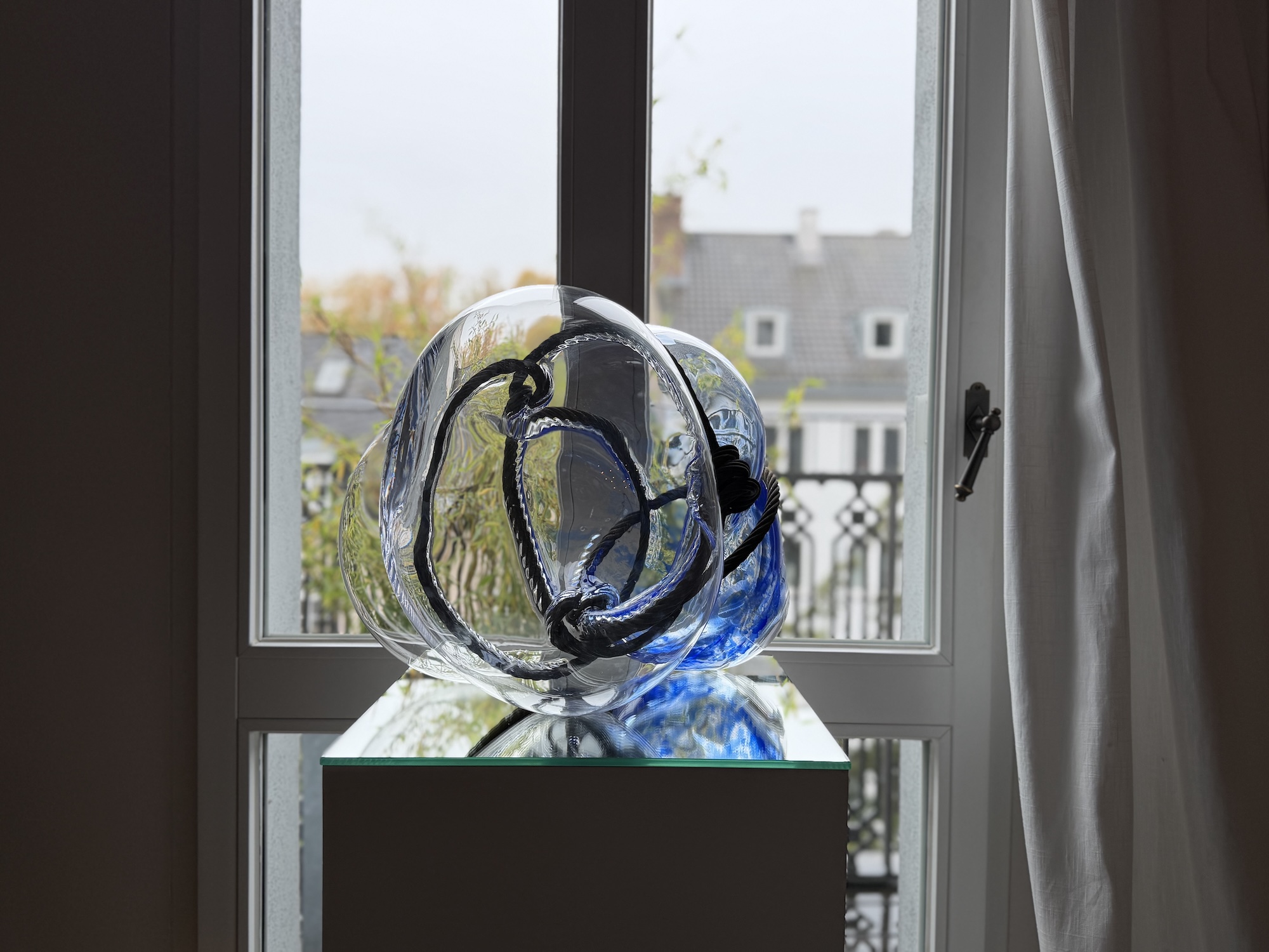 Ziel war es, die Kunst einmal im Kontext eines bewohnten Raumes zu zeigen – dort, wo die Bilder und Skulpturen letztendlich ihr Zuhause finden und ihre ganze Wirkung entfalten können. Ein besonderes Merkmal vieler Arbeiten von Nabo ist, dass sie sich in Fensterflächen integrieren lassen. Die Glasbilder können fest verbaut werden, in dem sie in Fensterrahmen eingelassen werwden oder aber mit speziellen Aufhängungen davor gehängt werden. Durch den Einfluss des Tageslichts entstehen in beiden Fällen immer neue Perspektiven.