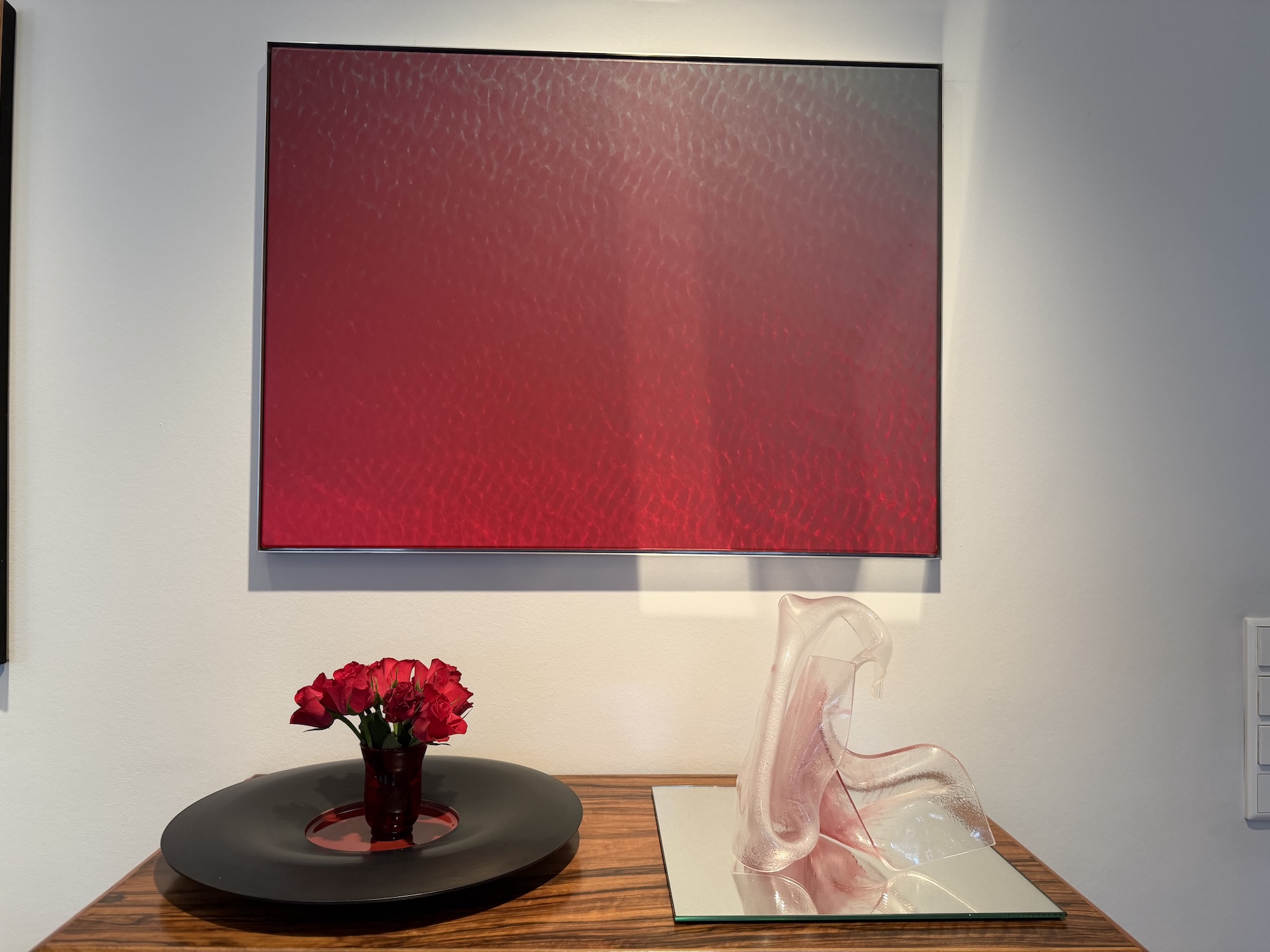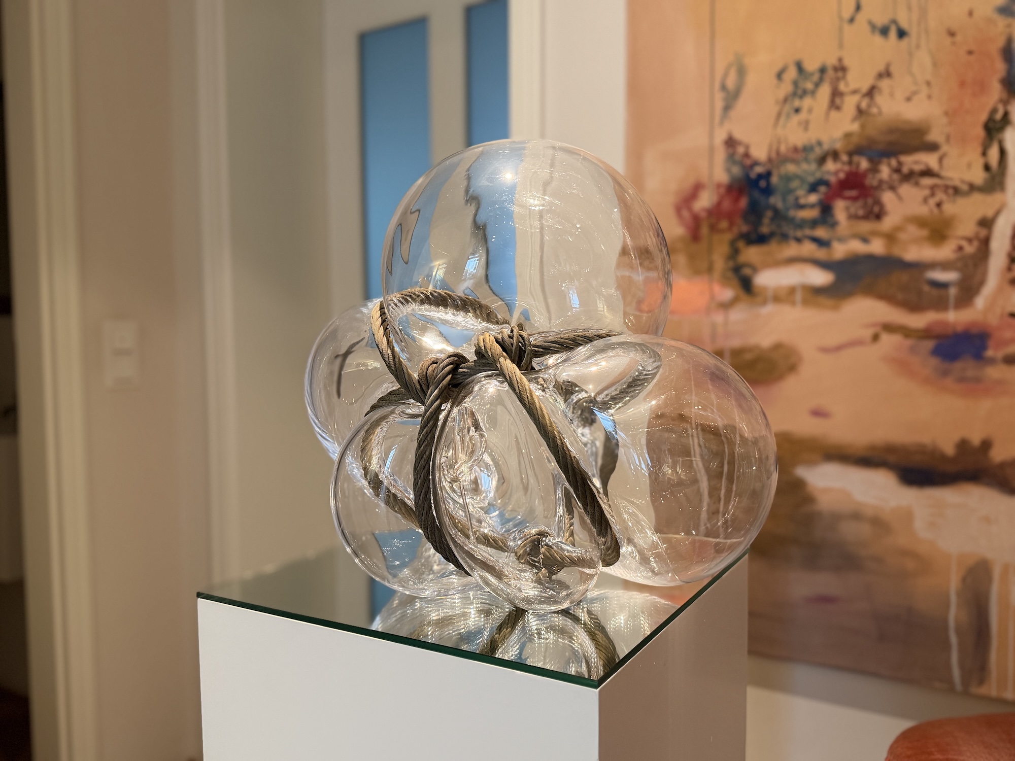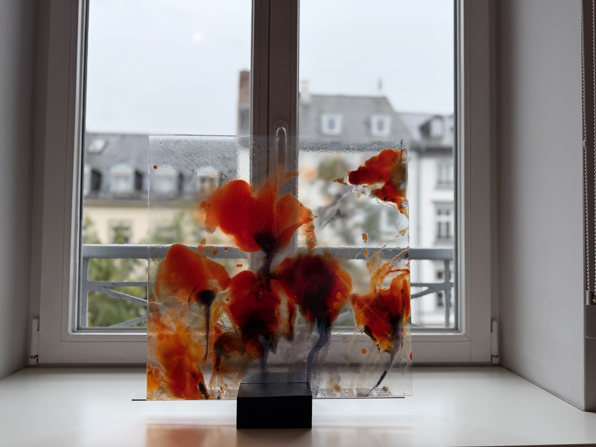 Ziel war es, die Kunst einmal im Kontext eines bewohnten Raumes zu zeigen – dort, wo die Bilder und Skulpturen letztendlich ihr Zuhause finden und ihre ganze Wirkung entfalten können. Ein besonderes Merkmal vieler Arbeiten von Nabo ist, dass sie sich in Fensterflächen integrieren lassen. Die Glasbilder können fest verbaut werden, in dem sie in Fensterrahmen eingelassen werwden oder aber mit speziellen Aufhängungen davor gehängt werden. Durch den Einfluss des Tageslichts entstehen in beiden Fällen immer neue Perspektiven.